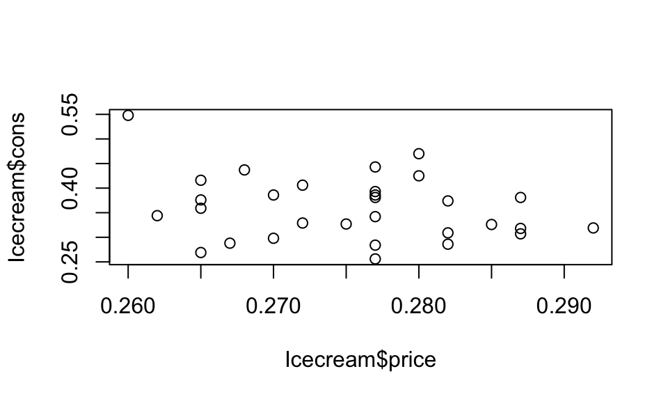 ?IcecreamReg1 <- lm(formula = cons~price+temp+I(price*temp), data = Icecream)