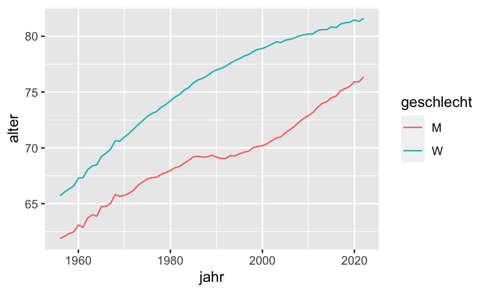 Betrachten wir den Plot mit dem durchschnittlichen Sterbealter, wird sofort klar, dass eine Binärvariable für das Geschlecht genutzt werden muss. In der Regression sehen wir dann, dass Frauen im Schnitt 6,6 Jahre länger leben als Männer.