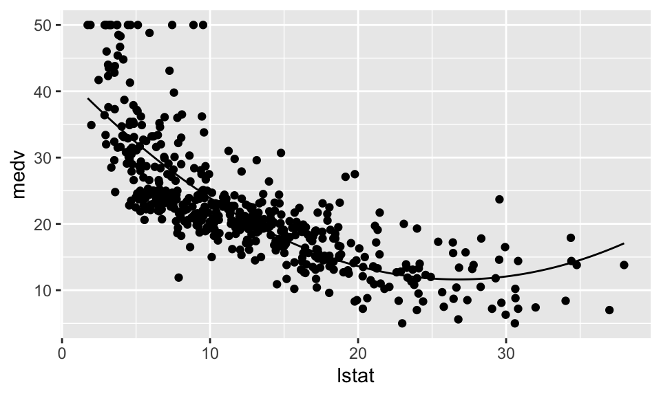 lm(formula = medv ~ lstat + I(lstat^2), data = housing)