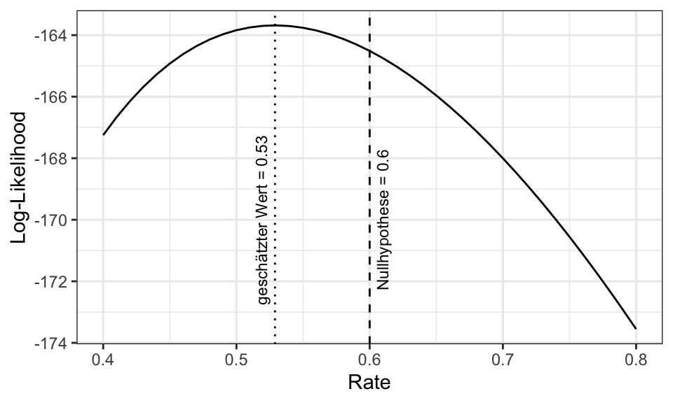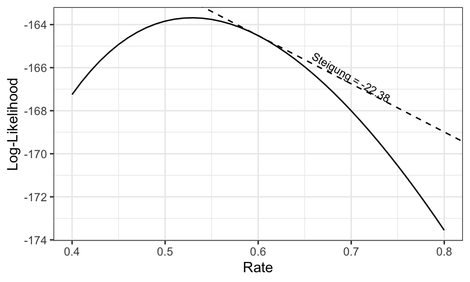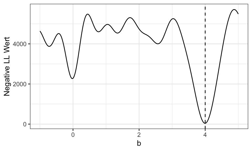 Für eine Schätzung der Parameter einer Normalverteilung wird zuerst die Dichtefunktion aufgestellt \[f(y_i | \mu, \sigma) = (2\pi \sigma^2)^{-1/2} \text{exp}(-\frac{1}{2}((y_i - \mu)/\sigma)^2)\] und aus dieser ergibt sich dann die Dichte der Stichprobe \[f(y_1, …, y_n | \mu, \sigma) = \prod_{i=1}^n f(y_i | \mu, \sigma) = (2\pi \sigma^2)^{-1/2} \text{exp}(-\frac{1}{2} \sum_{i=1}^n ((y_i - \mu)/\sigma)^2)\] Da das Produkt schnell zu sehr niedrigen Werten führen kann, wird stattdessen der Logarithmus verwendet \[LL(\mu, \sigma | y_1, …, y_n) = -\frac{n}{2} \ln(2\pi) - n \ln \sigma - \frac{1}{2}\sigma^2 \sum_{i=1}^n(y_i-\mu)^2\] Für die numerische Optimierung in R wird die optim() Funktion verwendet, welche ein Minimum sucht. Daher wird die negative Log-Likelihood Funktion verwendet.