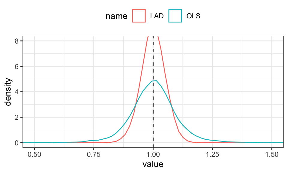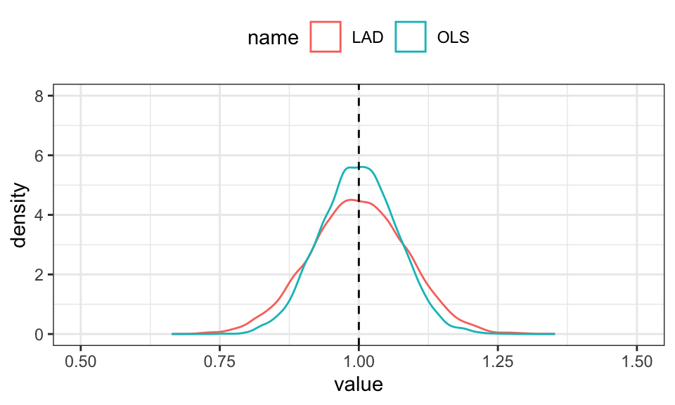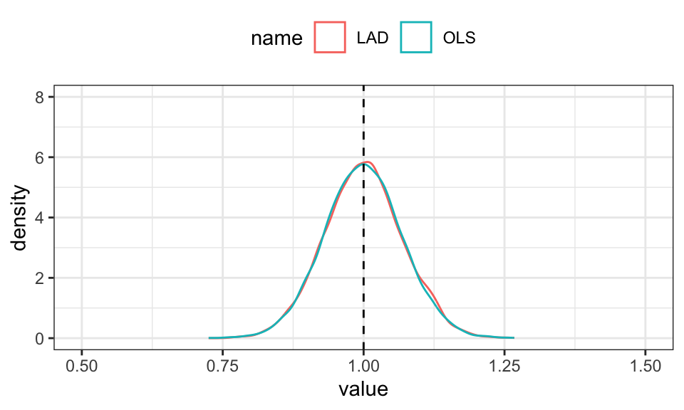 ACHTUNG: Der hier genutzte Least Absolute Deviations (LAD) Schätzer gehört nicht zu den linearen Schätzern und sollte daher eigentlich nicht zum Vergleich genutzt werden. Die folgenden Simulationen dienen also nur dazu, das Verhalten von OLS zu LAD bei verschiedenen Verteilungen der Residuen zu zeigen. Gleichzeitig ist auch zu erkennen, dass OLS nicht immer der beste Schätzer ist (auch wenn es manchmal so aussieht).