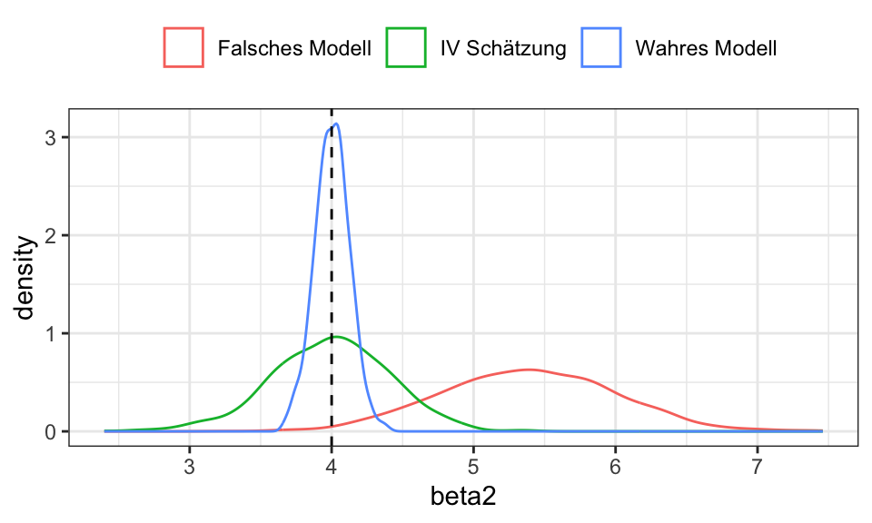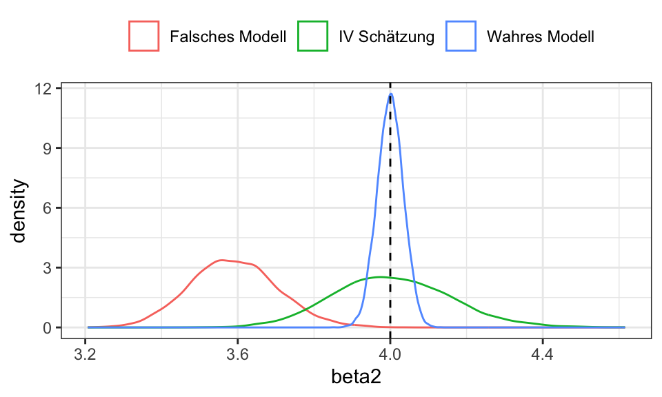 Die Instrumentvariablenschätzung trifft zwar im Mittel den wahren Wert von \(\beta_2\), weißt aber eine höhere Varianz auf als die OLS Schätzung des wahren Modells (ohne Messfehler).