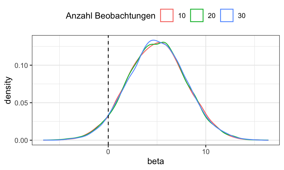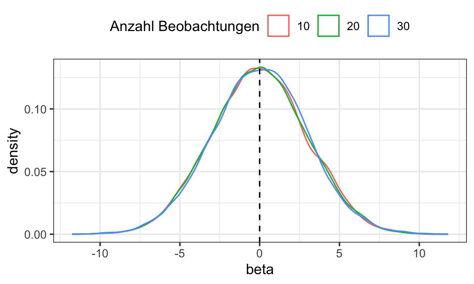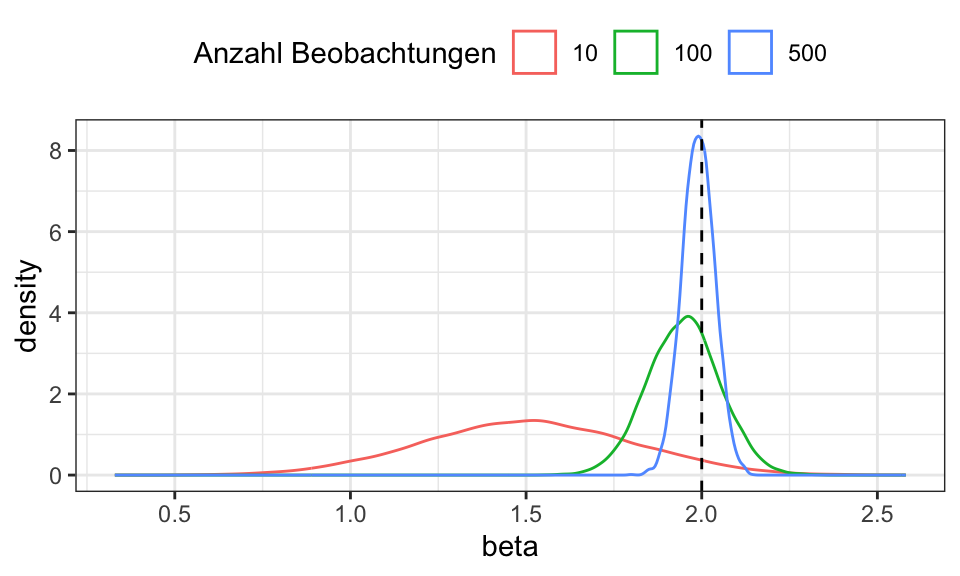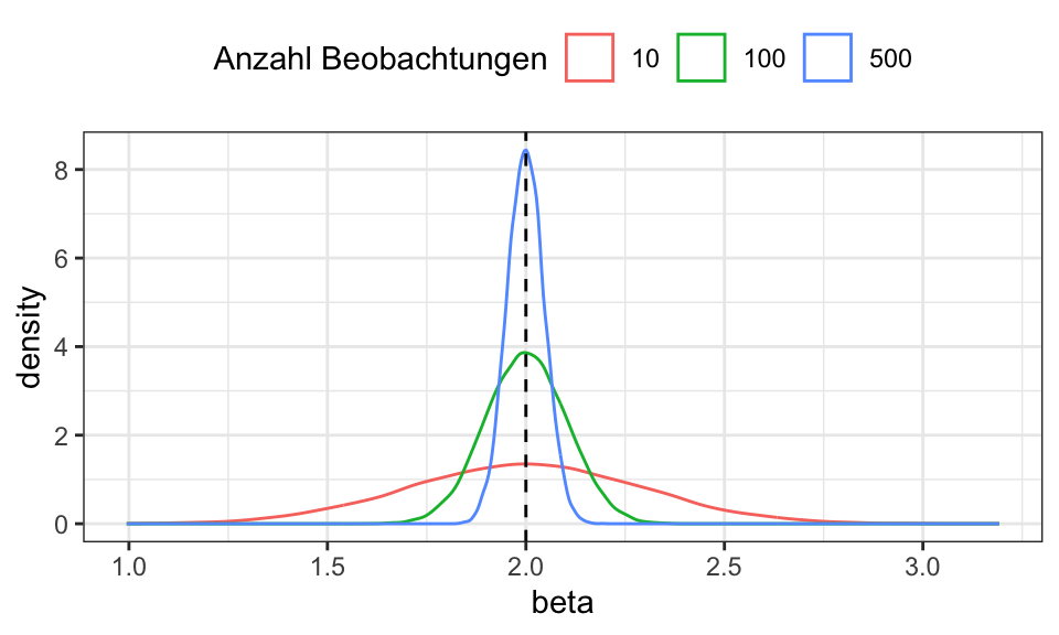 Ein erwartungstreuer und konsistenter Schätzer ist sozusagen der Musterschüler unter den Schätzern: Selbst für kleine Stichproben liefert er im Mittel den wahren Wert und mit größeren Stichproben sinkt noch die Streuung: \(E(\hat{\beta}) = \beta\) und \(Var(\hat{\beta}) = \frac{\sigma^2}{n} = 0\) für \(n \rightarrow \infty\)