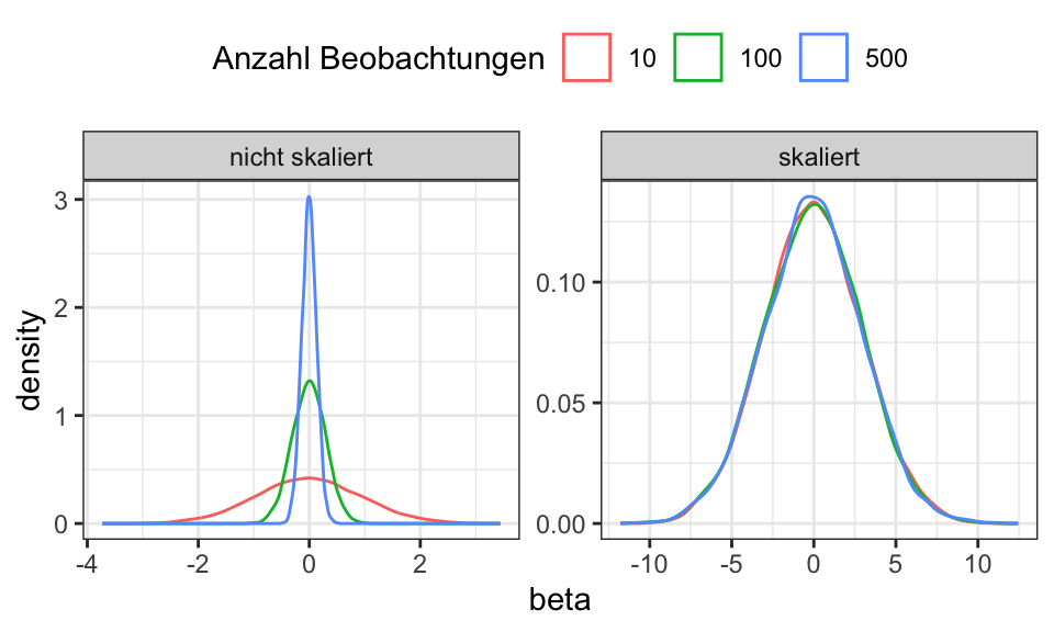 Um die Konsistenz eines Schätzers besser zu zeigen, kann dieser mit \(\sqrt{n}\) multipliziert werden. Dadurch bleibt die Varianz mit steigendem Stichprobenumfang konstant.